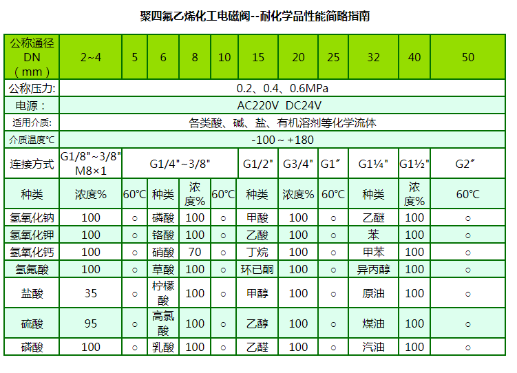 聚四氟乙烯化工电磁阀具有优异的耐腐蚀性能,对所有的常用化学品都呈惰性。几乎可以抵抗所有化学介质(包括浓硫酸和王水)。具有优异的耐热性能,应用温度为-100~180℃,材料可长期在230~260℃下工作。特别适合腐蚀严重、温度高且化学品不允许与润滑剂接触的环境。
