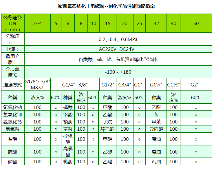 聚四氟乙烯化工电磁阀具有优异的耐腐蚀性能,对所有的常用化学品都呈惰性。几乎可以抵抗所有化学介质(包括浓硫酸和王水)。具有优异的耐热性能,应用温度为-100~180℃,材料可长期在230~260℃下工作。特别适合腐蚀严重、温度高且化学品不允许与润滑剂接触的环境。
