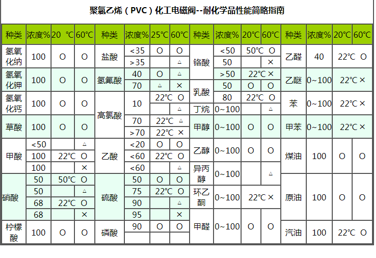 聚氯乙烯(PVC)化工电磁阀具有优良的耐腐蚀性能,耐酸(包括稀硝酸)、碱、盐、气体、水等的腐蚀。对无极性的烷烃及强极性的羧酸、醇类有较大的抗溶剂能力。少数氧化性酸在浓度较高时对其有较大的腐蚀作用。有一定的刚度和强度,适用温度为-0~60℃。